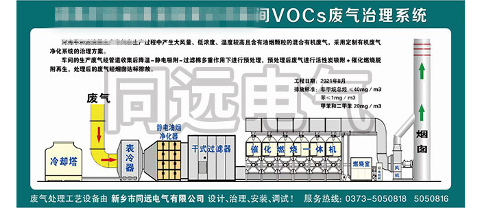 有機廢氣治理——車間的生產(chǎn)廢氣經(jīng)管道收集后降溫-靜電吸附-過濾棉多重作用下進行預(yù)處理,預(yù)處理后廢氣進行活性炭吸附+催化燃燒脫附再生,處理后的廢氣經(jīng)煙囪達標(biāo)排放。